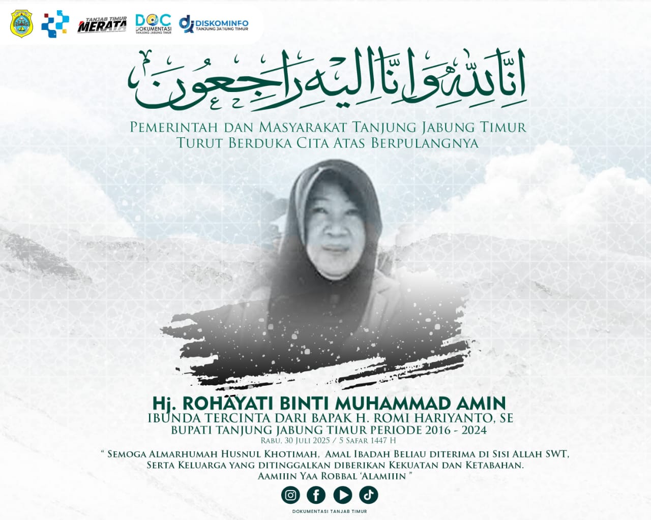 Almarhumah menghembuskan napas terakhir pada Rabu (30/7) di kediamannya. Kepergian sosok yang dikenal sebagai ibu penyayang dan istri salehah ini meninggalkan duka mendalam bagi keluarga besar dan masyarakat Tanjabtim.